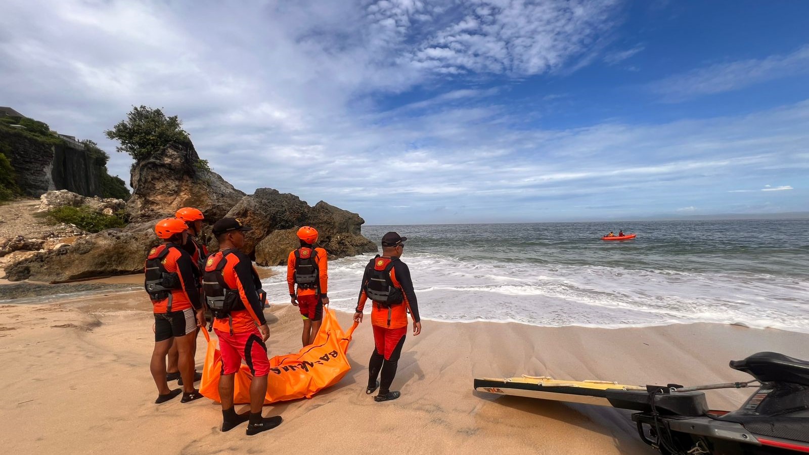 "Ada yang melihat sesuatu mencurigakan dari atas dan ia langsung memberikan tanda kepada SRU laut yang saat itu melakukan penyisisran di seputaran lokasi," jelas I Nyoman Sidakarya, Kepala Kantor Pencarian dan Pertolongan Denpasar (Basarnas). Dikarenakan adanya ombak, jetski tidak bisa merapat ke tebing, maka tim memutuskan menuju pesisir pantai terdekat lokasi.