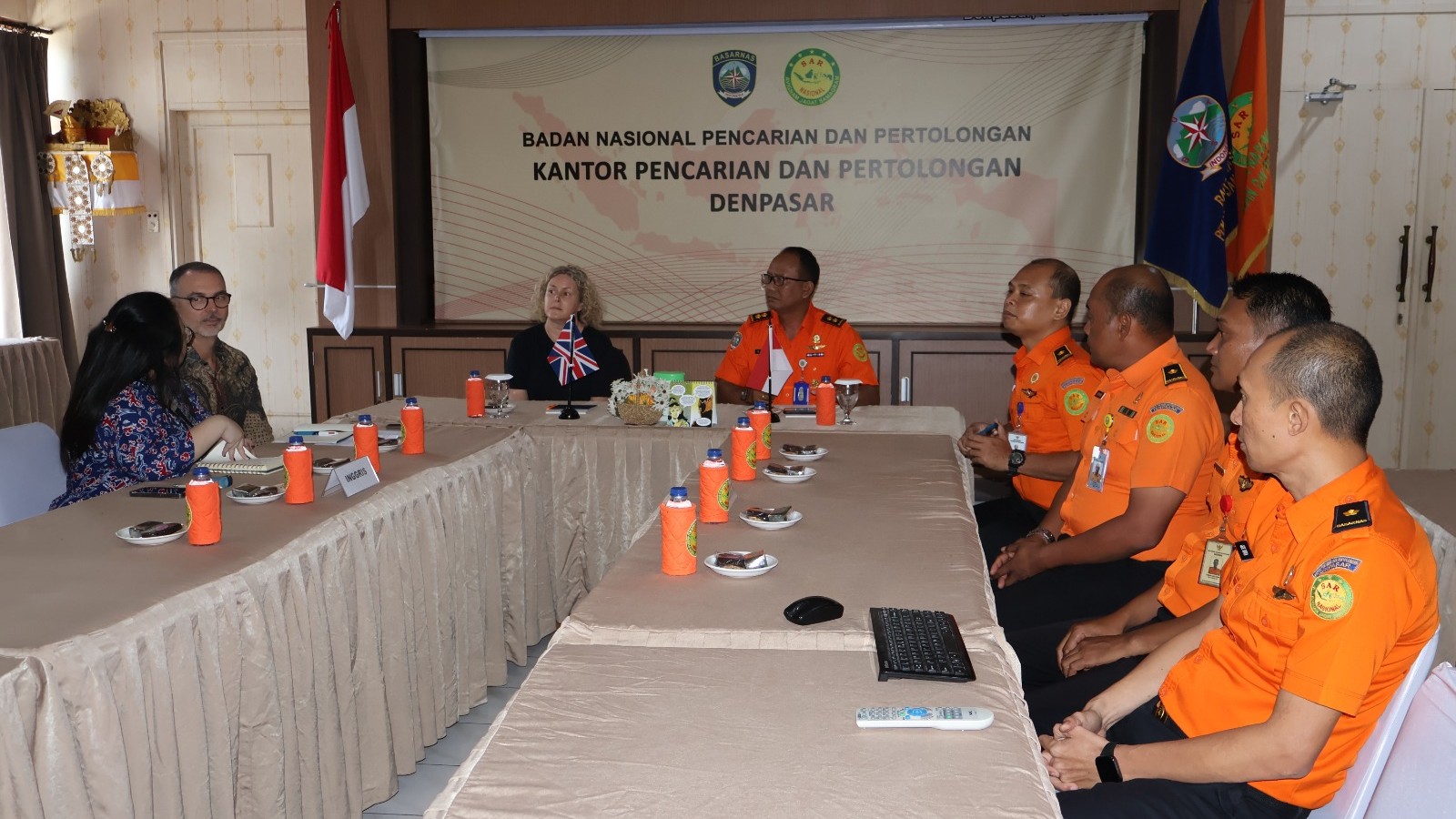 BADUNG --- Kepala Kantor Pencarian dan Pertolongan Kelas A Denpasr, I Nyoman Sidakarya, S.H. didampingi Kasubag Umum dan Kasi Sumber Daya menerima kunjungan Konsulat Inggris di Bali, Nigel Greetham pada Senin siang, (28/7/2025). Turut hadir pula Direktur Konsuler Regional Asia Pasifik, Catherine Allum. Audiensi diterima dengan hangat di ruang briefing, Gedung Bimasena Kantor Pencarian dan Pertolongan Denpasar.