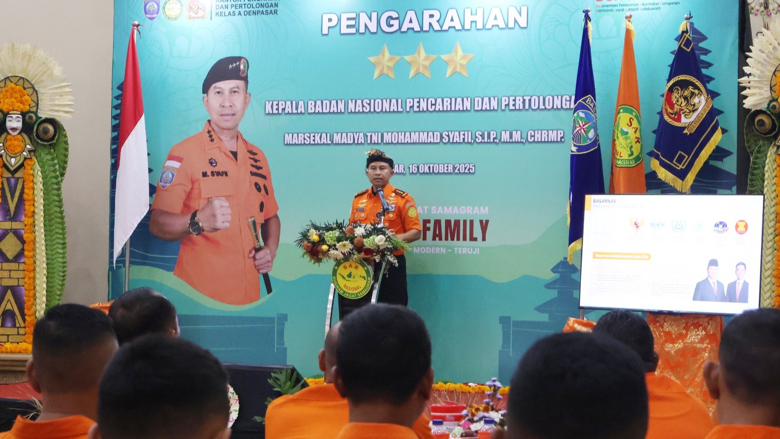 JIMBARAN --- Kepala Badan Nasional Pencarian dan Pertolongan (KABASARNAS), Marsekal Madya TNI Mohammad Syafii, S.IP., M.M., CHRMP melakukan Kunjungan Kerja ke Kantor Pencarian dan Pertolongan Denpasar, Kamis (16/10). Dalam kunjungan tersebut turut mendampingi Deputi Bidang Sarana dan Prasarana, Sistem Komunikasi dan Sekretaris Utama dan Kepala Biro Humas dan Umum. Momen ini merupakan kali pertama Kabasarnas bertandang ke Kantor Pencarian dan Pertolongan Denpasar. Selain Kepala Kantor Pencarian dan Pertolongan Denpasar, acara penting itu dihadiri perwakilan 3 Kepala Kantor wilayah tengah, yakni Mataram, Maumere dan Kupang.