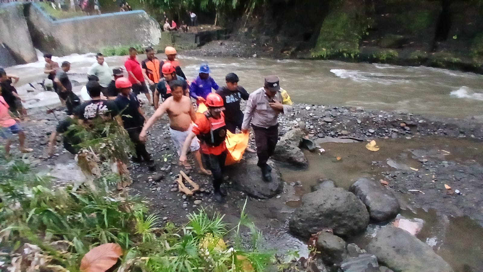 BADUNG --- Tim SAR gabungan mengevakuasi korban hanyut di di sungai DAM Banjar Tegal, Desa Dauh Cani, Kecamatan Abian Semal, Kabupaten Badung, Minggu (14/12/2025). Awalnya korban mandi di sungai sekitar pukul 15.25 Wita dan tiba-tiba terseret air bah.